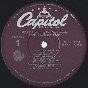 名シンガーソングライターFrankie Beverly擁するバンドMazeが、80年11月にニューオリンズで行ったライブ録音盤。 「Joy and Pain」や「The Look In Your Eyes」といった名曲の素晴らしいライブテイクも格好良いですが、スタジオ録音曲として追加されたB2「Before I Let Go」がやはり最高!! 洗練の極みとも言える完成度の高いバックとBeverlyの芳醇なヴォーカルが見事に絡み合う特大ダンスクラシックス!!
