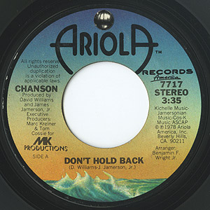David WilliamsとJames Jamerson JrのユニットChansonのファーストアルバムからのシングルカット。ナイスモダンディスコ「Don 't Hold Back」、メロウダンサー「Did You Ever」共にナイス!!