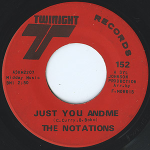Cliff Curryを中心とするシカゴのソウルグループThe Notationsの71年発表シングル。 Syl Johnsonがプロデュースを担当。 Curtis MyfieldのペンによるThe Impressionsの名曲カバー「I've Been Tryin'」、ジワジワと惹き込まれるメロウ/スウィート「Just You and Me」ともにグレイト!!