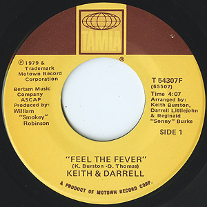 Darrell LittlejohnとKeith Burstonのデュオのデビューシングル。 後にセルフカバーをするSide-B「The Things You're Made Of」はサビの高揚感がクセになるグレイトメロウソウル!! 軽快な「Feel The Fever」ともに叔父のSmokey Robinsonプロデュース。
