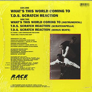 Michael K、D.J. Dev、Kool Geeから成るボストンのヒップホップトリオT.D.S. Mob (Treacherous, Devastating, Supreme Mob)のセカンドシングル。 「T.D.S. Scratch Reaction」は大ネタを散りばめたカットアップ/メガミックス的なアプローチが激渋!! Wattstaxの声ネタ使いの「What's This World Coming To」も渋いです。