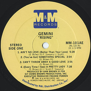 Fred SawyersとKarvin Johnsonの男性ヴォーカルデュオGeminiの81年リリースアルバム。 ダンスクラシックス「Can't Throw Away A Good Love」やブギー「Ain't No Love」、メロウ「A Pretty Lady」、電話の音で始まるA3「Can't Throw Away A Good Love」Billy Butler「I Don't Want To Lose You」のカバー等、ナイストラック満載の佳作!!