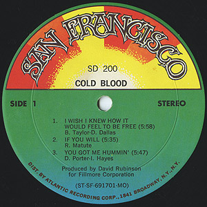 Lydia Pense擁するベイエリアのブラスロックバンドCold Bloodのファーストアルバム。 Jurassic 5が「Lausd」でサンプリングしたファンキーロック「I Just Want To Make Love To You」や、Lil Wayne「Days and Days」でイントロ部分がサンプリングされたB2「I'm A Good Woman」、Sam & DaveのカバーA3「You Got Me Hummin」といったナイストラックを収録です!!