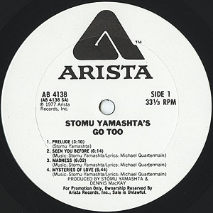 前衛的なプレイの日本人ジャズパーカッショニスト/鍵盤奏者ツトムヤマシタさんを中心とするプロジェクトGoの77年リリースレコード。Paul JacksonやLinda Lewisも参加。全編ヴォーカルをフューチャリングしており、ファンキーなB1「Wheels Of Fortune」、ソウルフルなB3「You and Me」、ロッキンなA3「Madness」といったナイストラックを収録です!!