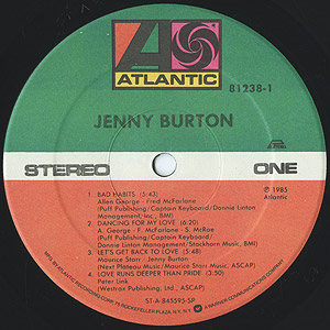 C-Bankでの活躍も知られる女性シンガーJenny Burtonの85年リリースレコード。2ndアルバム。 Jocelyn Brown「Somebody Else's Guy」にそっくりなダンスクラシック「Bad Habits」は勿論、アーバンファンク/ブギーB3「Nobody Can Tell Me」、メロウなエレクトリックファンクA3「Let's Get Back To Love」もおすすめです!!