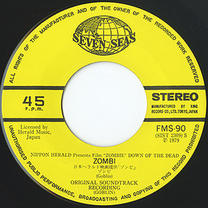 George Andrew Romero監督、78年公開の恐怖映画「ゾンビ」のオリジナルサウンドトラック7inch。音楽担当はClaudio Simonetti率いるGoblin。 メインテーマに相応しい重厚で暗い「L'alba Dei Morti Viventi」、プログレッシブな「Zombi」共にグレイト!!