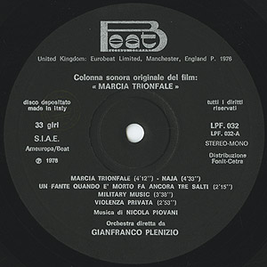 Marco Bellocchio監督、1976年公開映画「Marcia Trionfale」のオリジナルサウンドトラック。Nicola Piovaniが音楽を担当。流れるようなピアノ、うねるベース、タイトなドラムが絡み合うキラージャズファンクトラックB4「Pizzapop」、ボッサタッチのA4「Military Music」がおすすめです!!