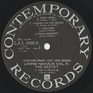 西海岸ジャズシーンの実力派アルトサックス奏者Lennie Niehausの56年発表5枚目のリーダーアルバム。4管セクステットでの録音。A3「Knee Deep」、A5「Take It From Me」、しっとりと聞かせるA4「Fond Memories」など自身作のホーンアンサンブルが心地良いクールなジャズが満載です。