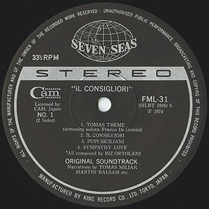 Alberto De Martino監督のマフィア映画「Il Consigliori (邦題:続・シンジケート)」のオリジナルサウンドトラック。こちらは74年リリースのジャケットデザイン違いの日本盤。 「2001」っぽい雰囲気を持った銃声/セリフ入りのジャズファンクB1「Il Consigliori」とA2「Il Consigliori」、美しい旋律のA4「Symphaty-Love」、軽やかなグルーヴのB3「Music Flute」がおすすめです!!