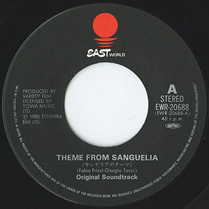 ルチオ・フルチ監督のホラー映画「サンゲリア」のオリジナル・サウンドトラック、シングル盤。 Fabio FrizziとGiorgio Tucciが音楽を担当。 リズムボックスやシンセを使った「Theme From Sanguelia」はスクリュープレイ(33回転プレイ)しても面白いドープトラック!!対極にあるような陽気なトロピカルトラック「Partenza Al'inferno」も良いです。