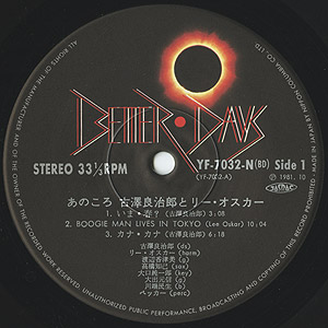 峰厚介や向井滋春のグループでの活躍も知られるジャズドラマー古澤良治郎と元Warのハーモニカ奏者Lee Oskarの共演盤。 軽やかなB1「キョン」やA2「Boogie Man Lives In Tokyo」辺りも良いですが、重厚なグルーヴと郷愁を誘うメロディーが絡み合う10分超えのタイトル曲「あのころ」がおすすめです。