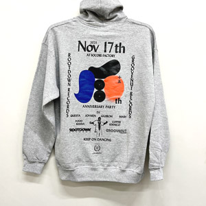 弊店とRootdown Recordsの15周年を記念したパーティーフライヤーを背中にプリントした限定のフーディーです。 デザインはPop Mag主宰、MoodymannやTheo Parrishのパーティーフライヤーも手掛けるグラフィックデザイナーのHaru-Kimさんです。 シルクスクリーンプリント 色:グレー ボディ:Gildan Heavy Blend