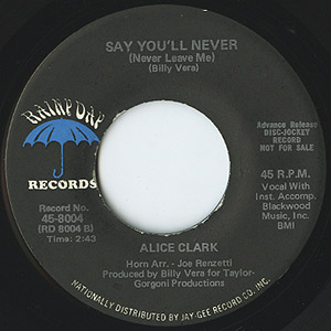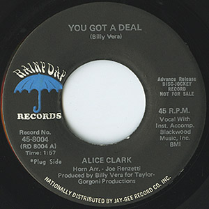 メインストリートレーベルからの大名盤で知られるシンガーAlice ClarkがスモールレーベルRainy Dayに残したレアシングル!!ノーザンソウルシーンでも人気のファンキートラック「You Got A Deal」、かの名盤の萌芽を感じるほっこりソウル「Say You'll Never」共にグレイト!!
